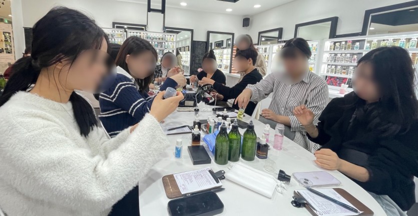 오늘은 조향사 선생님의 수업을 들으며 향의 기본 원리를 배우고, 직접 향료를 배합하며 나만의 향수를 만들어보는 시간을 가졌습니다!
